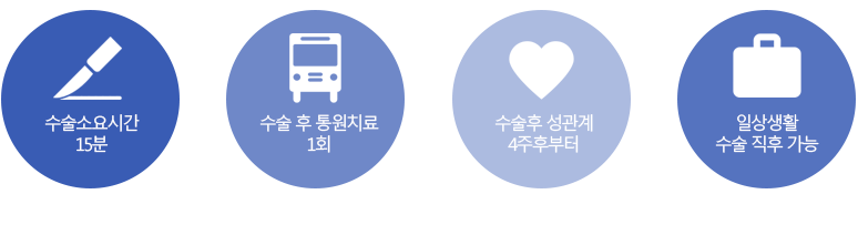 주변부의 구조물에 대해, 불필요한 손상을 일으키지 않고 음경의 감각신경 중 필요한부분만을 매우 정밀하게 차단합니다. 포경수술했던 자리를 이용하여, 귀두로 가는 감각신경의 일부를 선택적으로 차단하여 귀두를 둔하게 만듭니다.